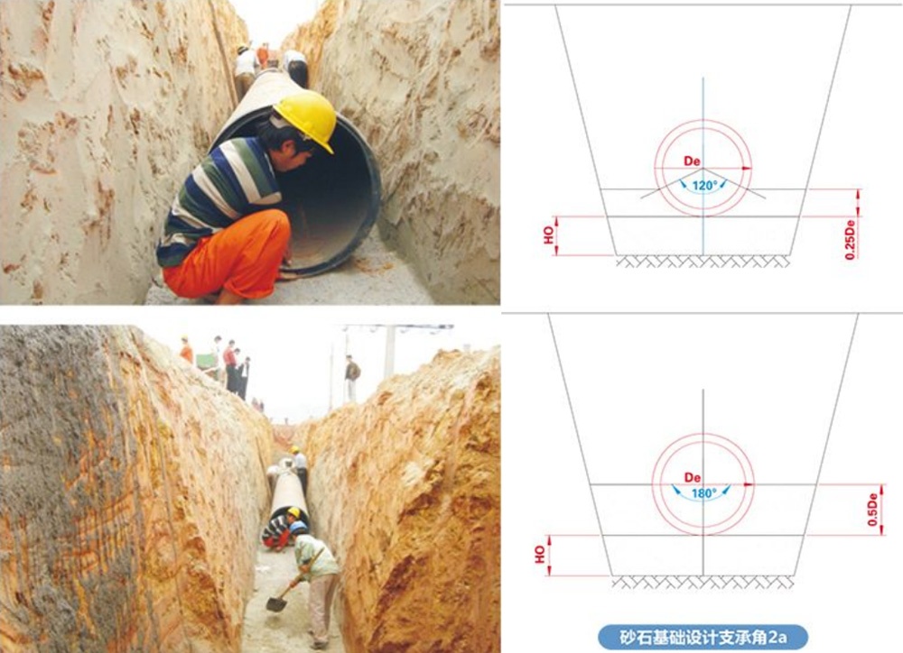 4.2 管道基础形式及管基有效支承角2a,应根据地质条件、地下水位、排水管径、管道埋深等条件确定。可参照下图: