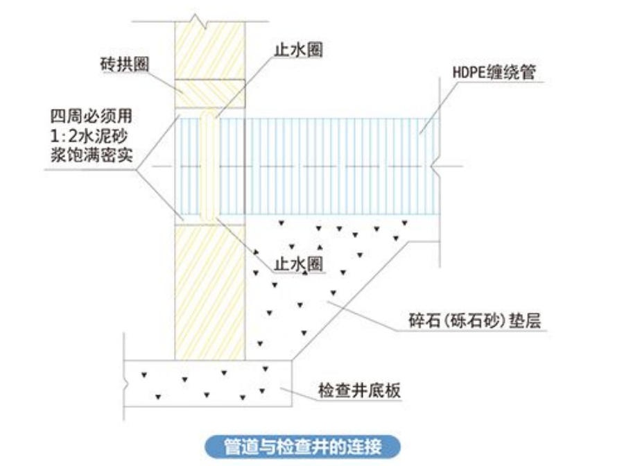 5.3 管道位于软土地基或低洼、沼泽、地下水位底的地段时,与检查井宜采用短管连接。即直接与检查井连接的连接管长度宜采用0.5~0.8m,后面再与整根管连接。与砖砌或混凝土检查井连接的短管上应设止水圈,短管与检查井相接合的表面砂浆应填充饱满,以保证短管与检查井紧密结合,防止结合处渗水(见图)。